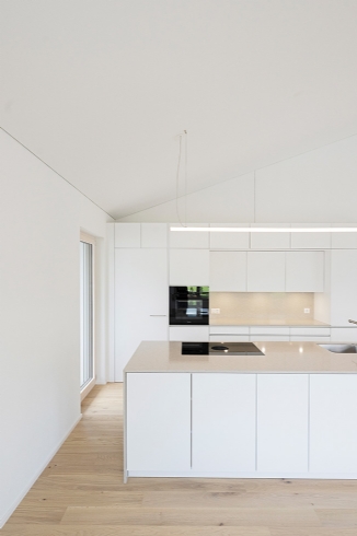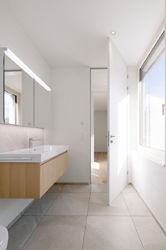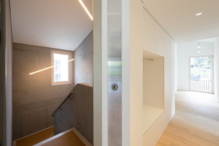 Die Häuser orientieren sich an der gewachsenen Struktur des Quartiers, um eine harmonische Integration ins Ortsbild zu gewährleisten. Durch die versetzte Anordnung der Baukörper entstehen differenzierte Räume, die den Innenhof als funktionales und zugleich lebendiges Zentrum formen. Hauszugänge, ein grosszügiger Fahrrad- und Recyclingbereich sowie Besucherparkplätze strukturieren den Innenhof klar, während Sitzgelegenheiten unter dem markanten Haselbaum zu Begegnungen und behaglichem Verweilen einladen.
